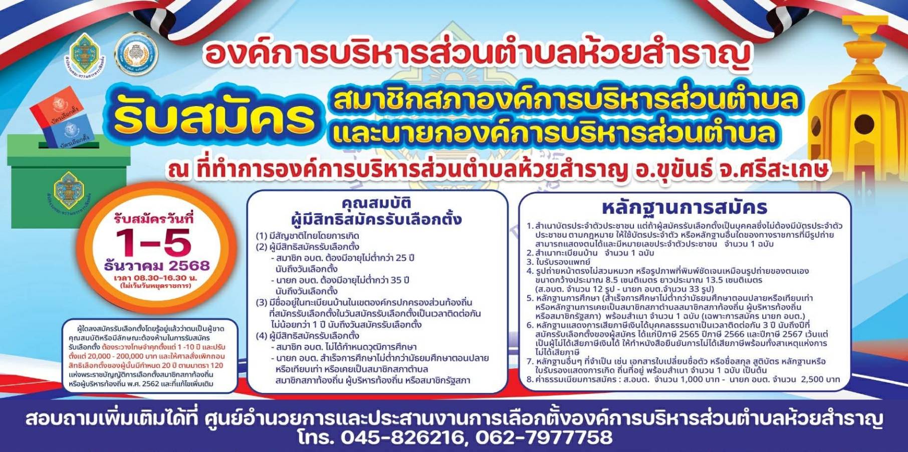 องค์การบริหารส่วนตำบลห้วยสำราญ รับสมัครสมาชิกองค์การบริหารส่วนตำบลและนายกองค์การบริหารส่วนตำบล