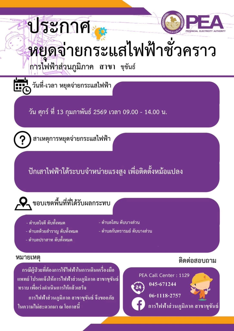 หัวข้อ :: การไฟฟ้าส่วนภูมิภาค สาขาขุขันธ์ แจ้งหยุดจ่ายกระแสไฟฟ้าชั่วคราวในเขตพื้นที่ตำบลปราสาท ใจดี ห้วยสำราญ ดับทั้งหมด และดับบางส่วนโสน กันทรารมย์ ในวันศุกร์ ที่ 13 กุมภาพันธ์ 2569 เวลา 09.00-14.00 น.