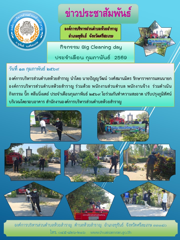 วันที่ 13 เดือนกุมภาพันธ์ 2569 พนักงานส่วนตำบล พนักงานจ้าง ร่วมดำเนินกิจกรรม บิ๊ก คลีนนิ่งเดย์ ประจำเดิอนกุมภาพันธ์ 2569 ณ ที่ทำการองค์การบริหารส่วนตำบลห้วยสำราญ