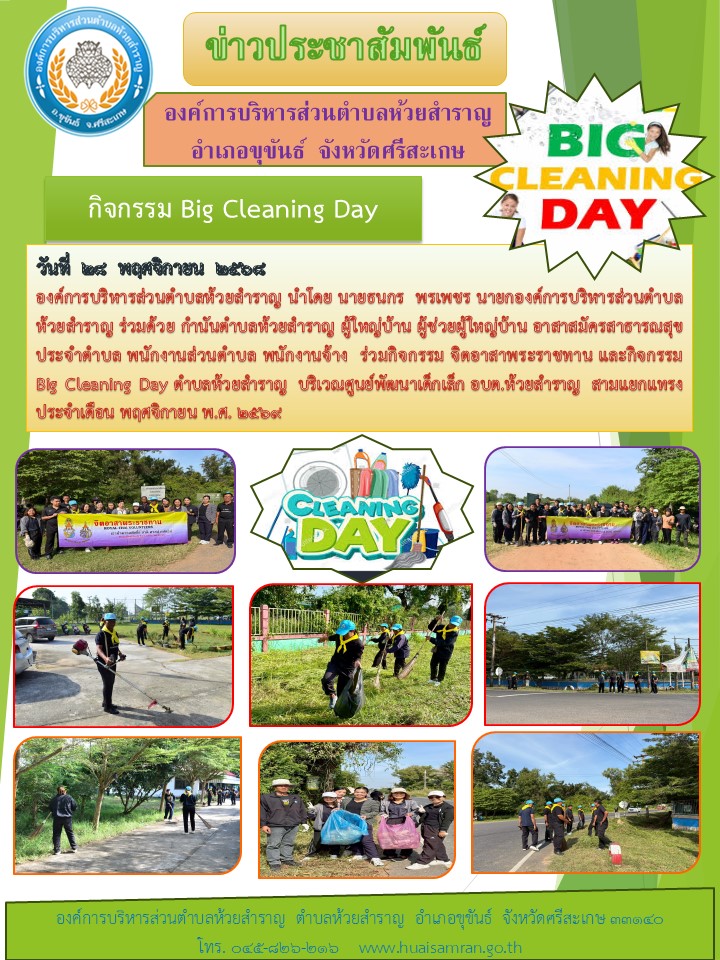 วันที่ 28 พฤศจิกายน 2568 องค์การบริหารส่วนตำบลห้วยสำราญ ร่วมกับผู้นำชุมชน อาสาสมัครสาธารณสุขประจำตำบล จิตอาสาพระราชทาน ร่วมจัดกิจกรรม บิ๊ก คลีนนิ่งเดย์ บริเวณสามแยกแทรง ศูนย์พัฒนาเด็กเล็ก อบต.ห้วยสำราญ
